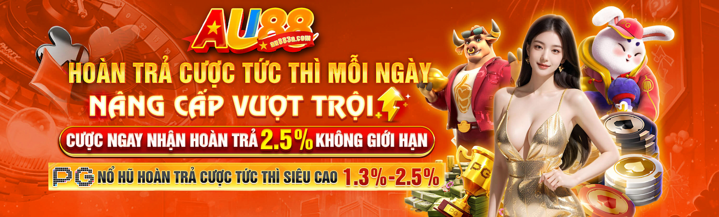 - Hoàn trả không giới hạn: AU88 áp dụng hoàn tiền tự động theo từng sảnh cược, cụ thể như thể thao hoàn 1.58%, game bài hoàn 0.5%, nổ hũ và bắn cá lên tới 3%, đảm bảo người chơi luôn có cơ hội giảm rủi ro và gia tăng lợi nhuận.